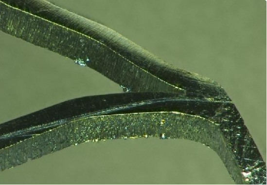 显微镜下心脏支架上的氧化层和细微毛刺